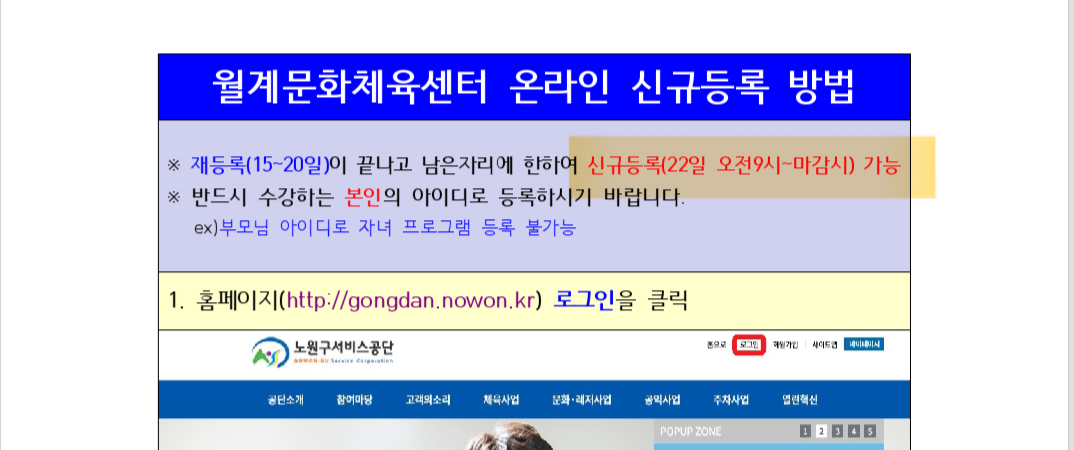 안녕하십니까? 귀하께서 ‘민원상담’를 통해 신청하신 민원(S24-00062)에 대한 검토결과를 다음과 같이 알려드립니다. 귀하의 민원은 상계구민체육센터 수강신청 일자에 대한 문의로 판단됩니다. 귀하의 민원사항에 대해 검토한 의견은 다음과 같습니다. 1) 먼저 신규접수 이용에 어려운점이 있었던 점을 죄송스럽게 생각합니다. 상계구민체육센터는 처음 오픈하는 기관으로 기존 체육센터와는 달리 신규접수일을 2024.02.20.(화) 일시적으로 정하여 운영하게 되었습니다. 운영에 대한 일자 홍보 내용은 홈페이지 및 방문, 현수막을 통해 전달을 하였습니다. 말씀하셨듯이 홈페이지는 팝업을 통해 진행하여 회원들이 상시 볼 수 있도록 홈페이지 첫화면에 홍보하였습니다. <홈페이지 화면> 2) 또한, 공지사항 알림을 통해 상계구민체육센터의 운영안내문과 관련하여 아래와 같이 신규접수일을 상시 홍보하였습니다.