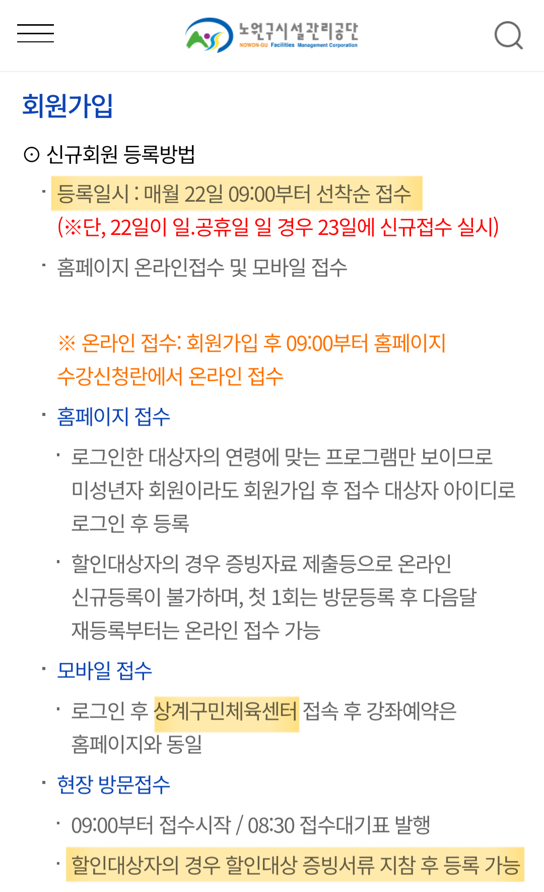 저는 노원구민이고, 노원구청에서 제공하는 1월 소식지를 통해 '상계구민체육센터'의 개관 소식을 접했습니다. 이후 관심을 가지고 신규등록을 마음먹었습니다. 첨부했다시피 노원구시설관리공단 사이트의 '상계구민체육센터'의 모든 정보에 신규등록일이 22일 9시부터로 명시되어 있습니다. 저는 여러 번의 확인 끝에 신규등록일을 오늘(2024.02.22.)로 여기고 번호표 배부 시간(08시 30분)에 맞추어 상계구민체육센터로 향했습니다. 요금 감면 대상자라 서류 제출을 위해 현장 접수를 택했습니다. 접수처에 신규등록 번호표를 받으러 왔다고 말씀드리자 돌아온 답변은 "오늘이 아니고 20일이다. 이미 모두 마감되었다."였습니다. 저는 당황해서 사이트의 '상계구민체육센터' 수강신청란에 22일이라고 적힌 것을 보여드렸으나 직원분께서는 "공지에 20일로 적었다. 20일에 이미 마감되었고 헷갈린 분은 없었다.", "얼마 전 사이트를 개편하면서 그 부분만 수정이 안 되었다."였습니다. 한 달 전부터 일정을 등록하고, 며칠 전 동사무소에서 할인 대상자 증명서를 떼고, 아침 일찍 버스를 타고 눈에 양말이 젖음에도 기대하며 향한 공립 기관에서 듣기에는 무책임한 답변이었다고 생각합니다. 해당 사이트를 처음 이용하는 만큼 사이트에 대해 잘 몰랐습니다. 그래서 이용할 '상계구민체육센터'의 안내사항을 최대한 꼼꼼히 읽었고, 모든 곳에 22일이라고 적혀 있기에 의심하지 않았습니다. 잘못 안내한 센터 측의 실수인데 '당신이 헷갈렸고, 헷갈린 사람은 당신밖에 없다.'라는 건 너무하지 않나요 . 심지어 돌아오는 길에 재확인하니 직원분 변명처럼 그 부분만 수정이 안 된 것도 아니고, 오히려 수정되어 있는 부분이 한 군데도 없었습니다. 20일이라 적힌 곳은 공지사항뿐, 막상 이번에 새로 개관하는 '상계구민체육센터' 안내에는 22일이라는 말 밖에 없습니다. 그 외에 저와 직원분이 나눈 대화를 요약하자면 '상계구민체육센터 측의 잘못이어도 다음달 신규등록 때 다시 신청하는 방법밖에 없다. 기존등록 후 신규등록을 진행하니 자리가 안 빌 수도 있지만 그건 어쩔 수 없다.'입니다. 개인의 잘못이라고 생각하지는 않습니다. 당연히 이미 마감된 자리에 끼어 넣어달라는 얘기도 아닙니다. 하지만 공립 기관인 상계구민체육센터의 잘못이 명백한 만큼, 희망 시간대에 자리가 나는 경우 우선적으로 신규등록을 하게 해달라 정도의 요구는 하고 싶습니다. 상기 요구사항에 대한 긍정이 아니더라도 이번 일에 대한 적절하고 설득력 있는 답변을 듣고 싶습니다. 어쩔 수 없다는 되풀이 답변은 아니기를 바랍니다. 감사합니다. *첨부파일은 노원구시설관리공단 사이트 > 체육서비스 > 상계구민체육센터에서 확인할 수 있는 신규등록 정보를 캡쳐한 이미지입니다. 개중 월계구민체육센터의 안내사항도 상계구민체육센터의 온라인 신규등록 안내 자세히 보기를 통해 다운받은 파일입니다. |