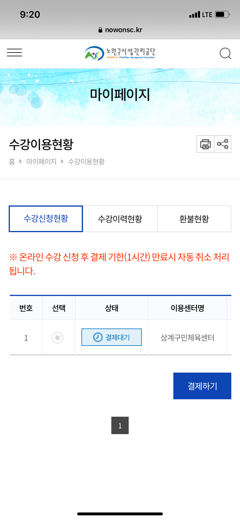 처리완료 [상계구민체육센터] 헬스장 결제 후 결제대기 상황 |