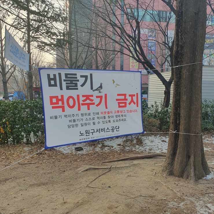 ▲ 노원구서비스공단 본부와 인접한 중계근린공원 쉼터의 비둘기 먹이주기와 관련된 민원이 우리 공단으로 자주 접수되고 있습니다. 중계근린공원은 우리 공단의 관리 시설은 아니나 노원구민의전당 주변 정비 또한 공단의 임무라 생각하고 민원을 해소하고자 금지 안내 현수막을 게첨하였습니다. 향후 상황 발견 시 적극 계도하도록 하겠습니다.