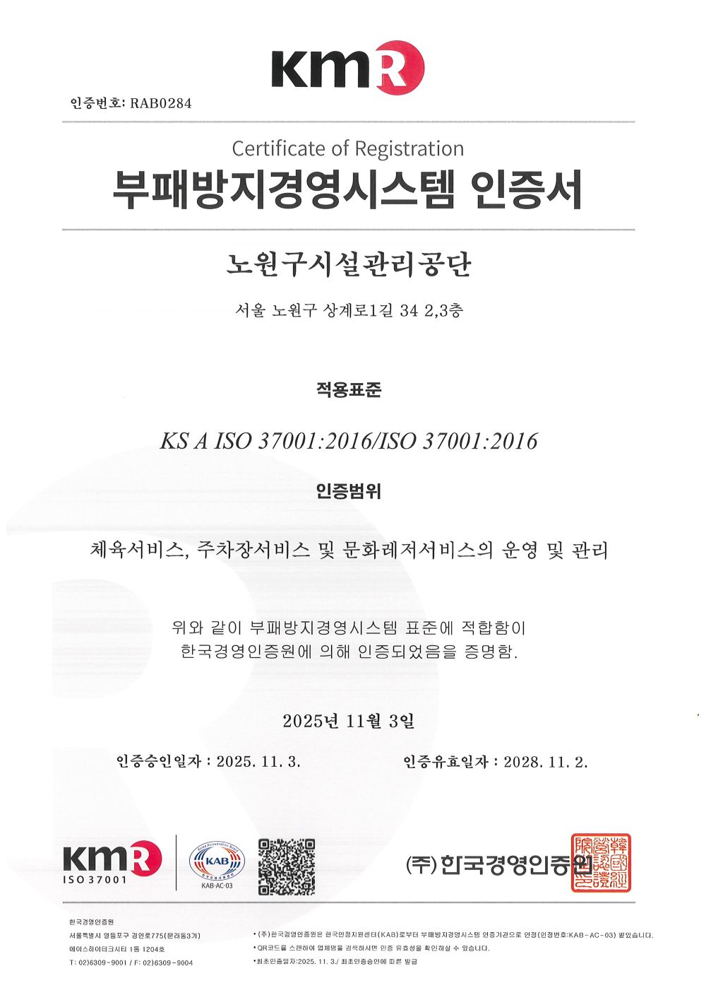 노원구시설관리공단, 부패방지경영시스템 국제표준 ‘ISO 37001’ 인증 취득