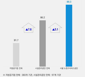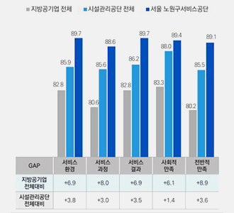 공단의 종합만족도는 89.3점으로, 시설관리공단 전체 점수에 비해서는 3.1점 높게, 지방공기업 전체 점수에 비해서는 7.6점 높게 나타남