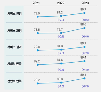 서울 노원구서비스공단 연도별 종합 만족도는 2021년 79.8점에서 2022년 81.4점으로 1.6점 상승했으며, 2022년 81.4점에서 2023년 89.3점으로 7.9점 상승함.