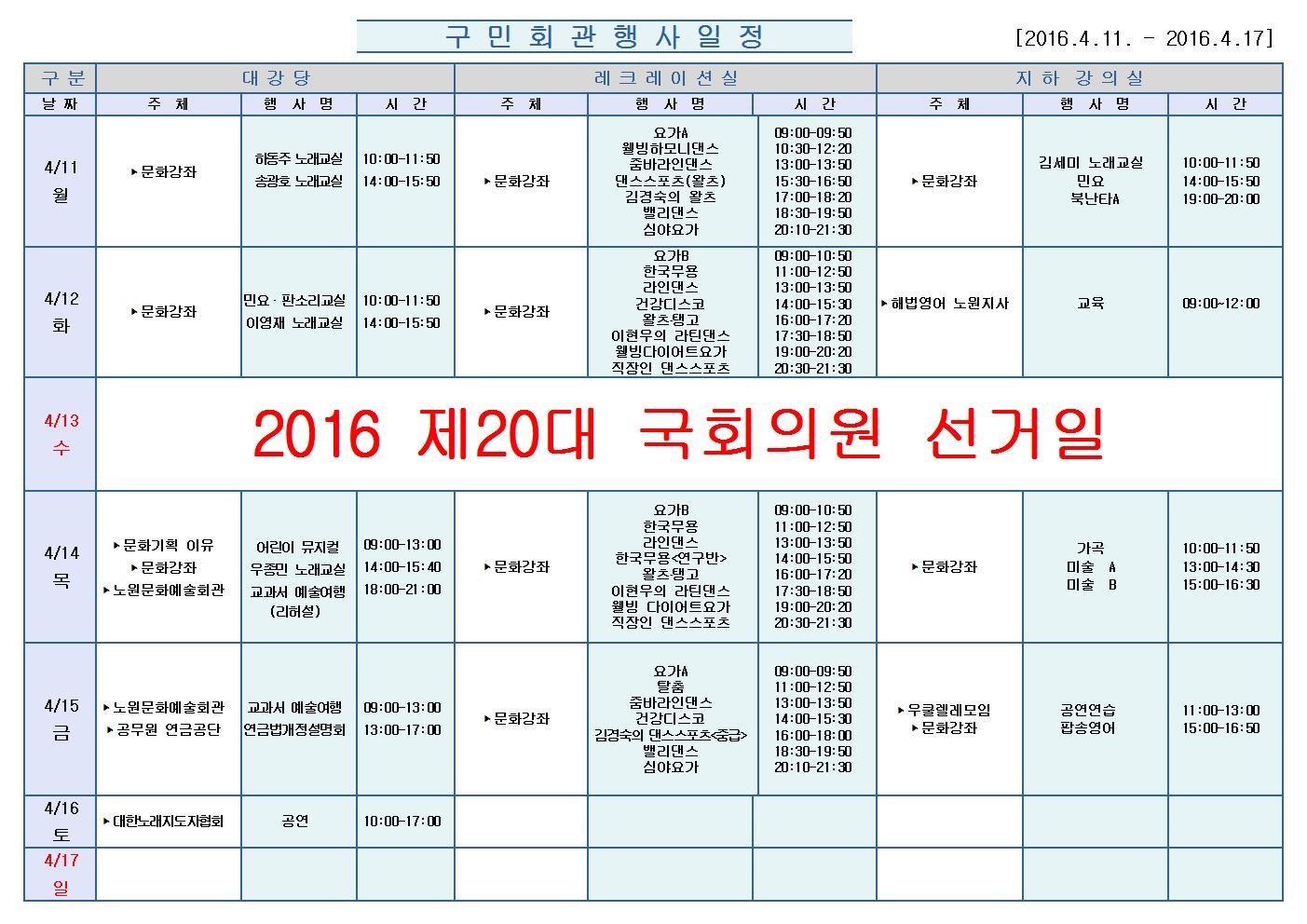 4월11일 월요일부터 4월 17일 일요일까지의 구민회관 행사 일정을 공지해드리오니