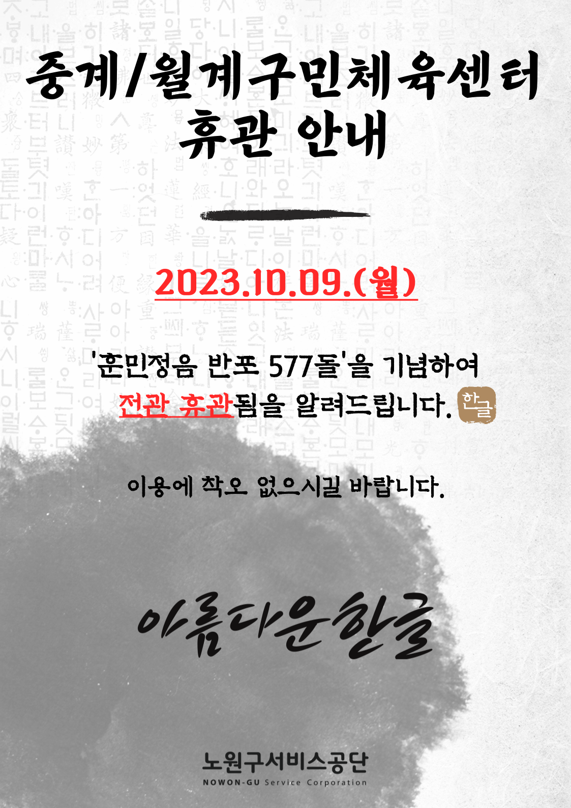 [중계/월계구민체육센터] 한글날 휴관 안내
