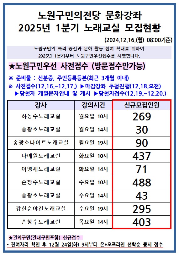 [노원구민의전당]2025년 1분기(1월 ~ 3월) 문화강좌 신규접수 가능 인원 현황