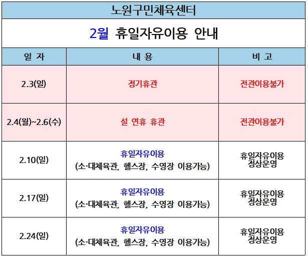 [노원구민체육센터] 2월 휴일자유이용 안내