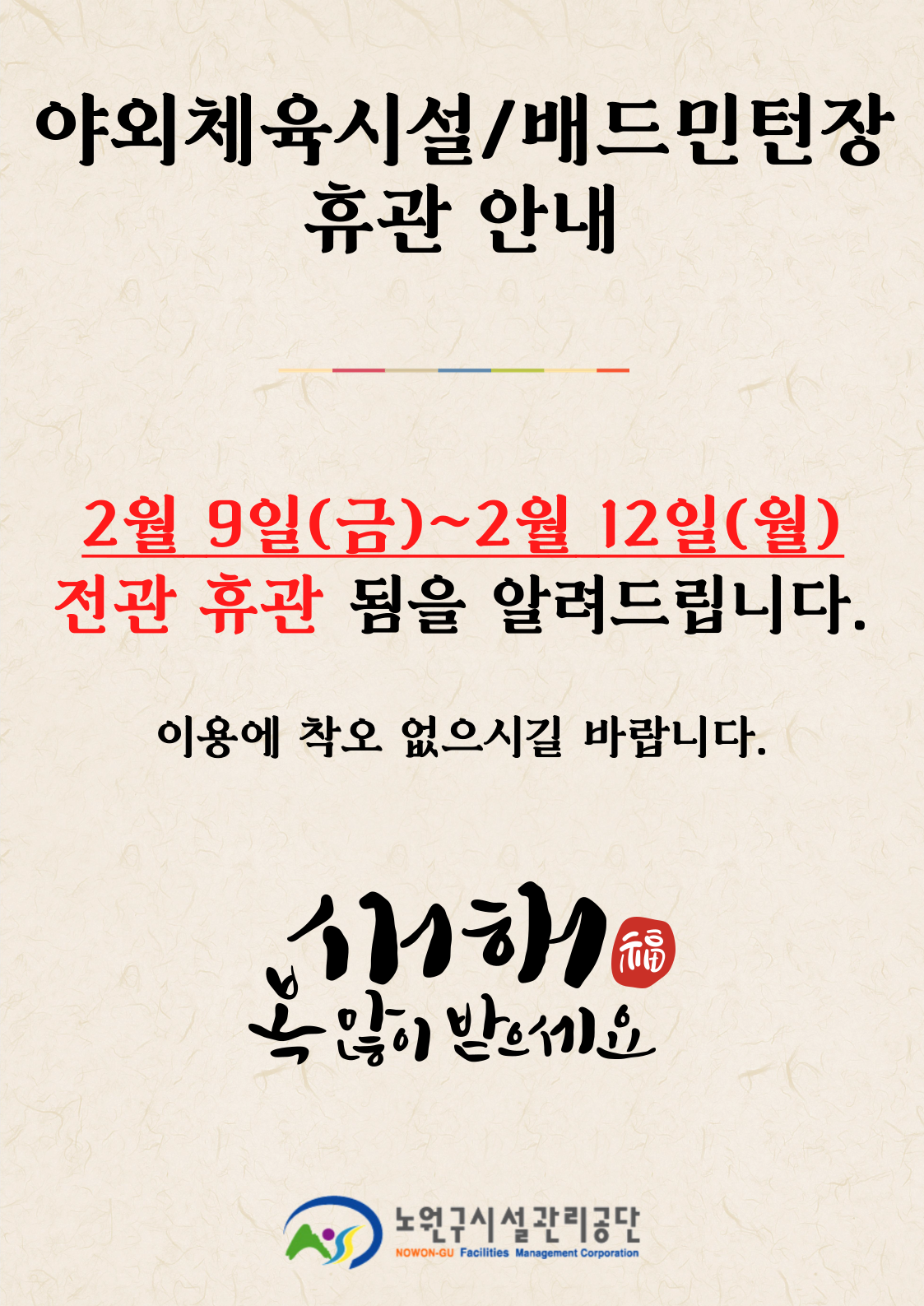 [야외체육팀] 설 연휴 휴관 안내문