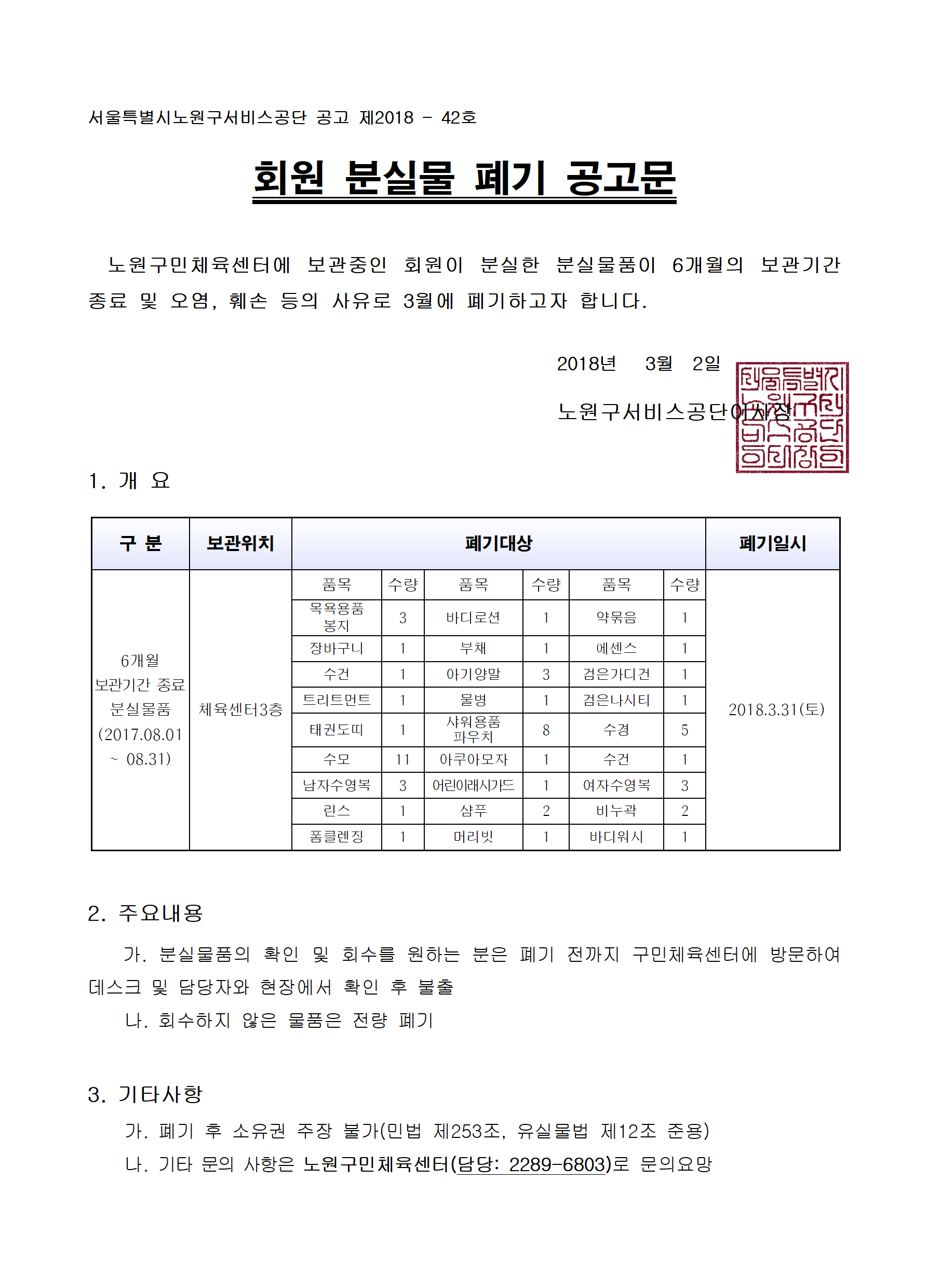 [노원구민체육센터] 3월 회원 분실물 폐기 공고문