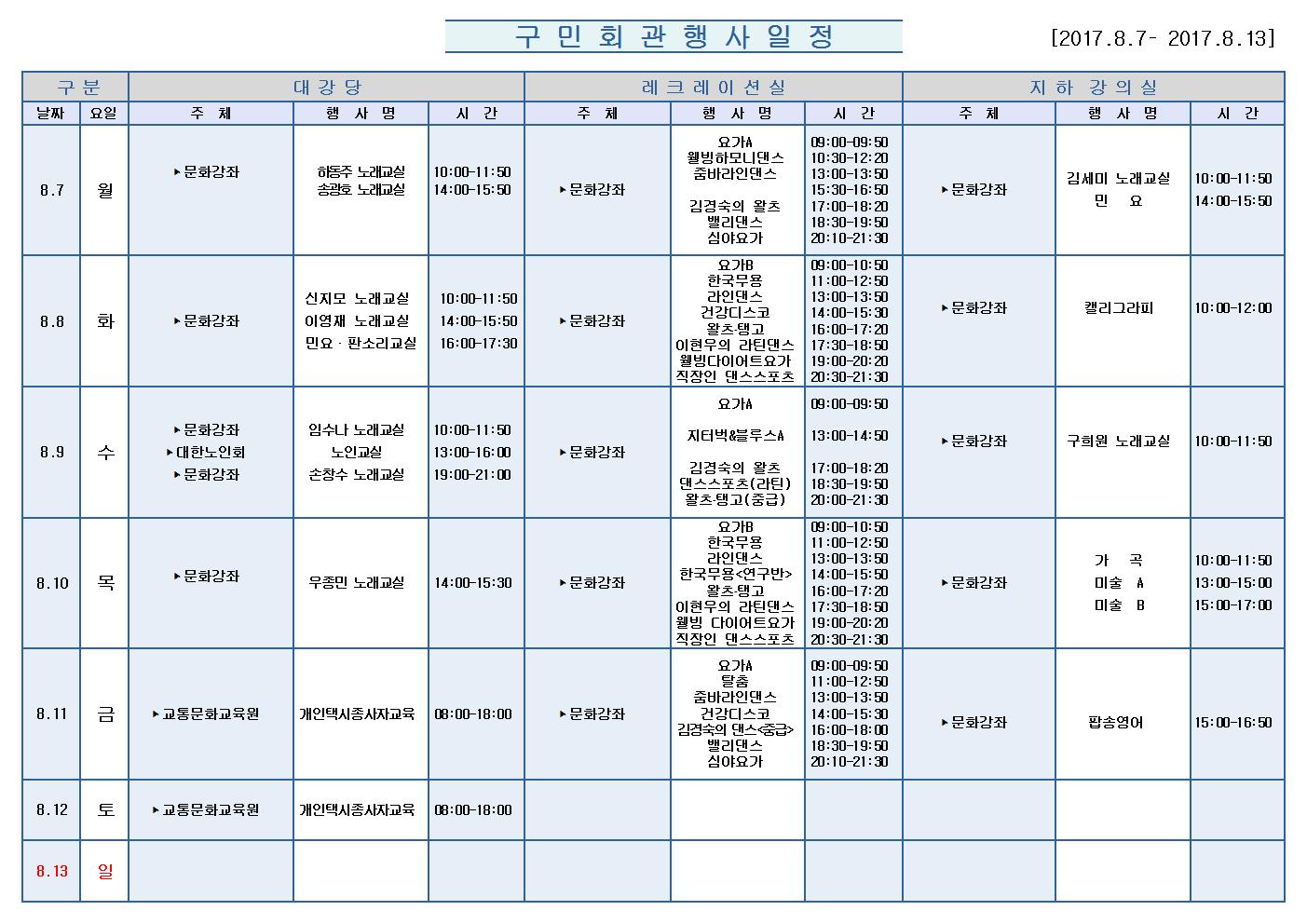 8월7일(월)부터 8월13일 (일)까지의 구민회관 행사 일정을 공지해드리오니