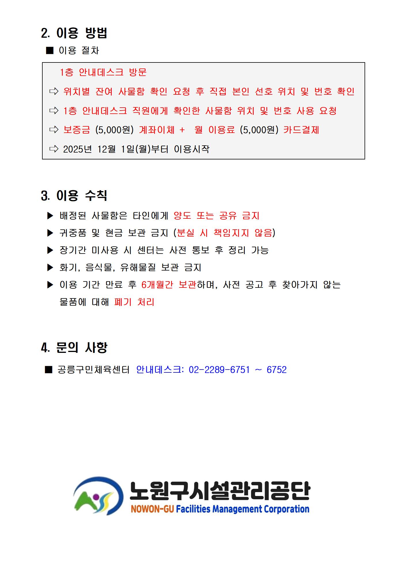 [공릉구민체육센터] 신규 개인사물함 배정 안내
