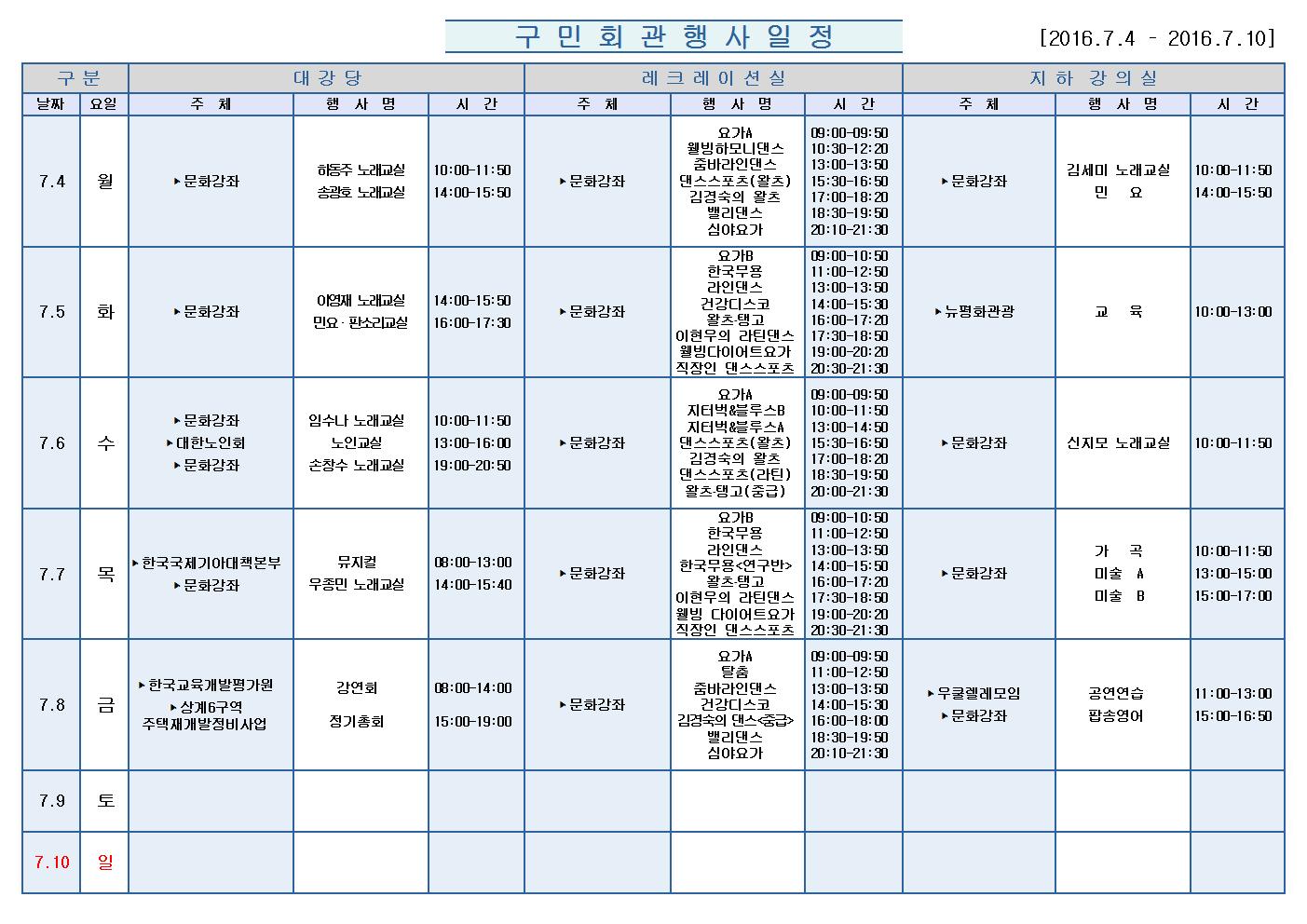 7월4일(월)부터 7월 10일 (일)까지의 구민회관 행사 일정을 공지해드리오니