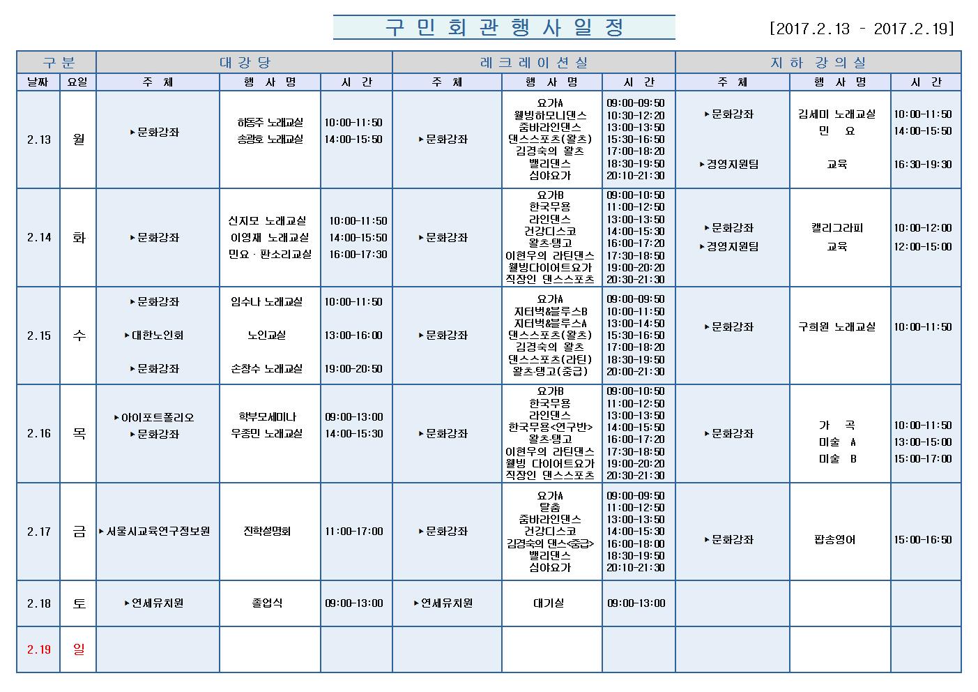 2월13일(월)부터 2월 19일 (일)까지의 구민회관 행사 일정을 공지해드리오니