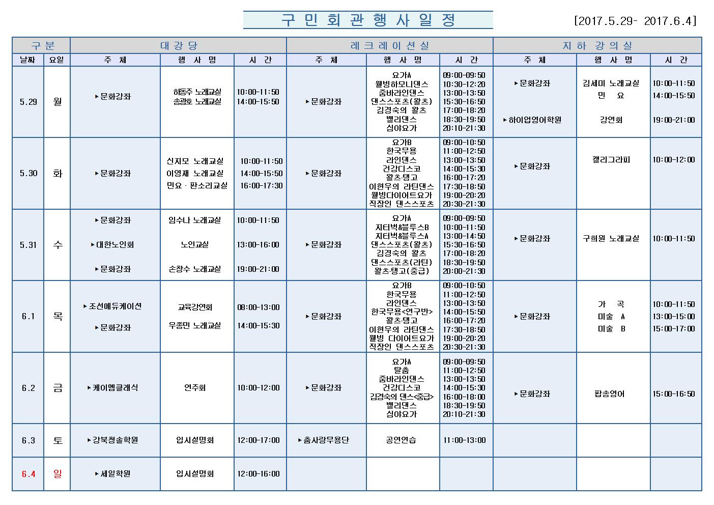 5월29일(월)부터 6월 4일 (일)까지의 구민회관 행사 일정을 공지해드리오니