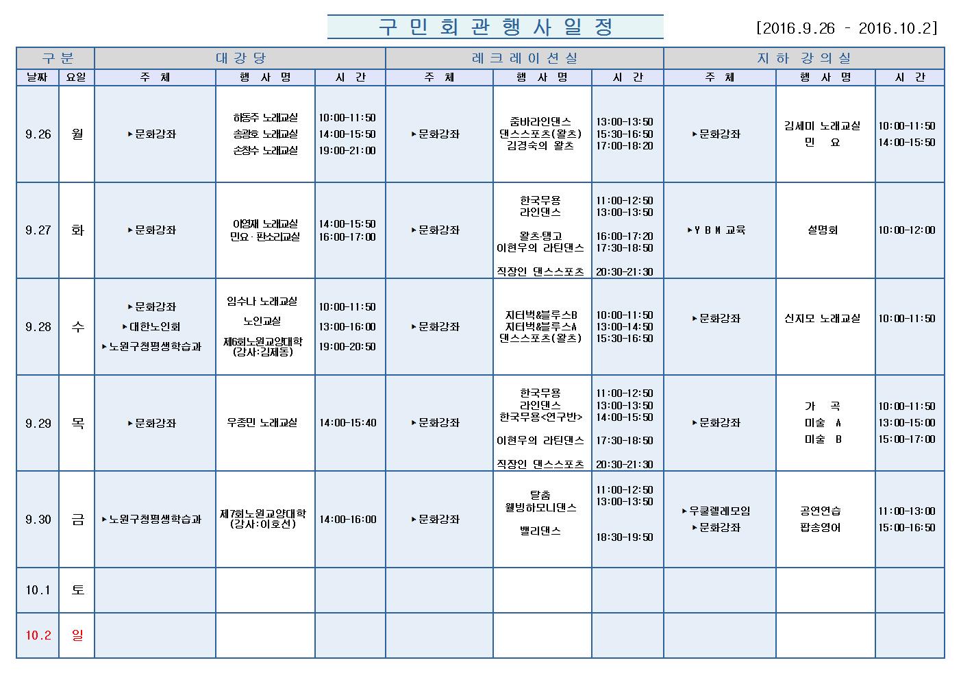 9월26일(월)부터 10월 2일 (일)까지의 구민회관 행사 일정을 공지해드리오니