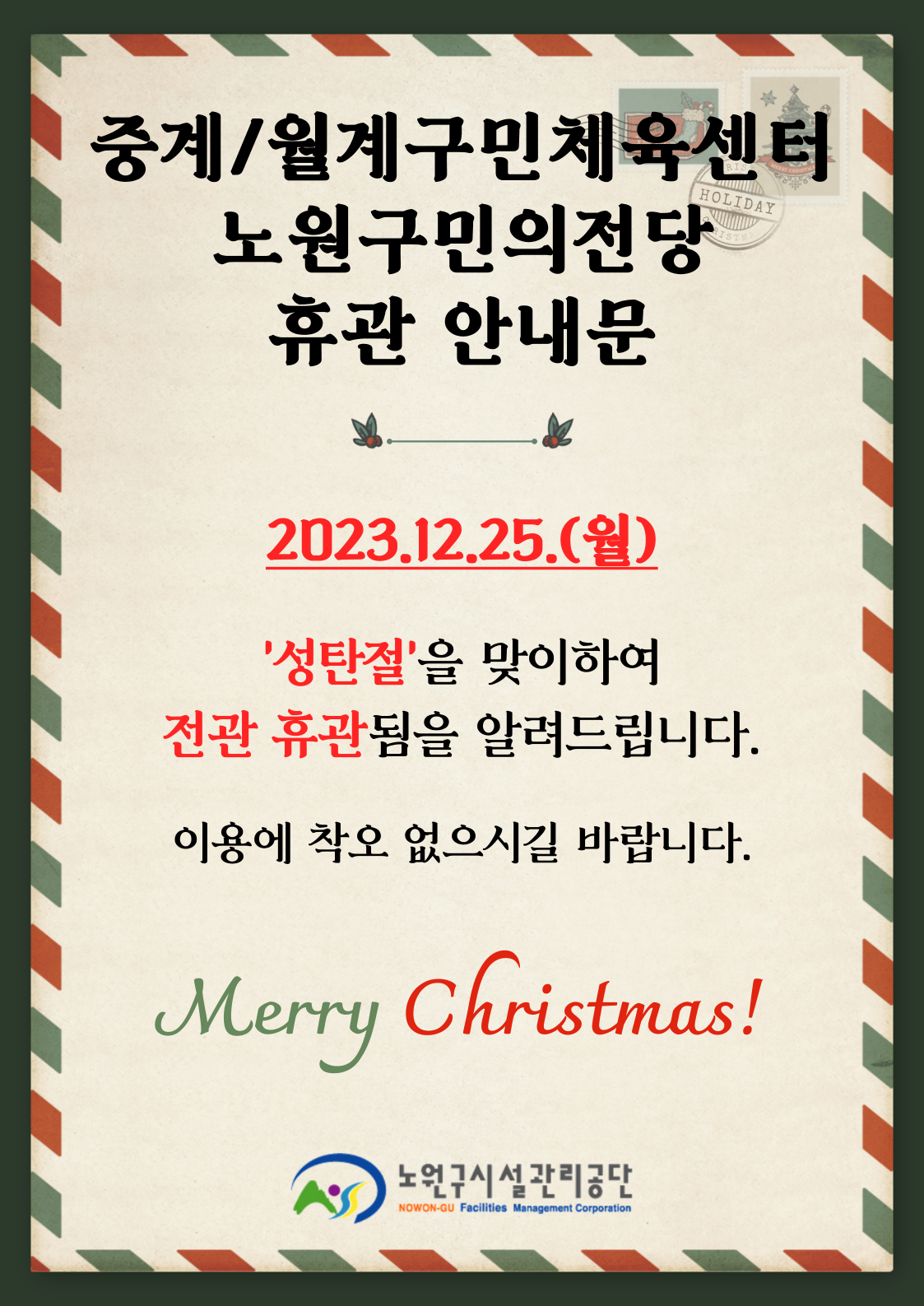 [중계/월계구민체육센터/노원구민의전당] 성탄절 휴관 안내