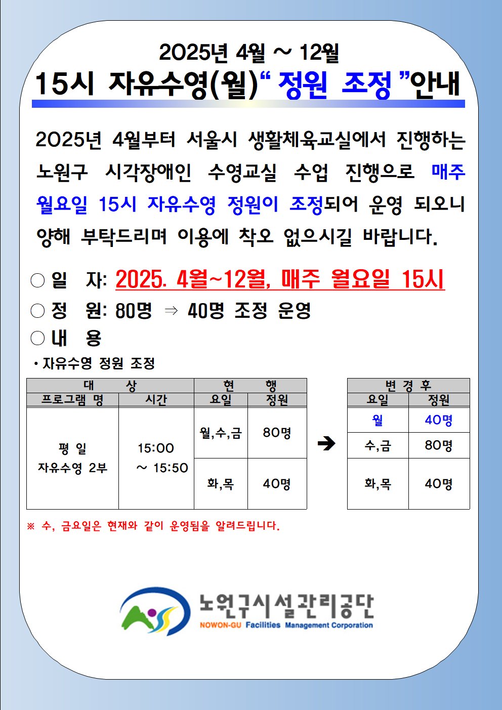 안녕하십니까? 월계구민체육센터입니다. 서울시 생활체육교실에서 진행하는 노원구 시각장애인 수영교실 실시로 인하여 4월~12월 평일 자유수영 2부(매주 월요일)자유수영 정원이 조정 되오니 이용에 착오 없으시길 바라며 이해와 양해 부탁드립니다.