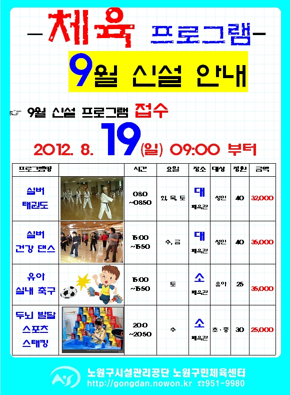 노원구민체육센터 체육프로그램이 9월신설 되었습니다.