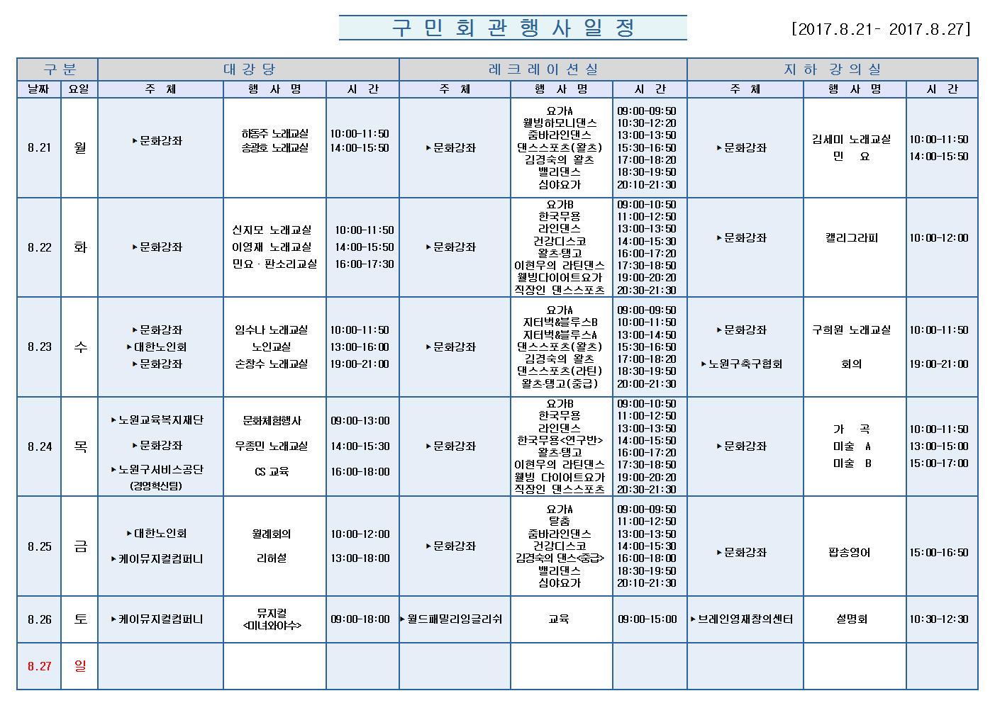 8월21일(월)부터 8월27일 (일)까지의 구민회관 행사 일정을 공지해드리오니