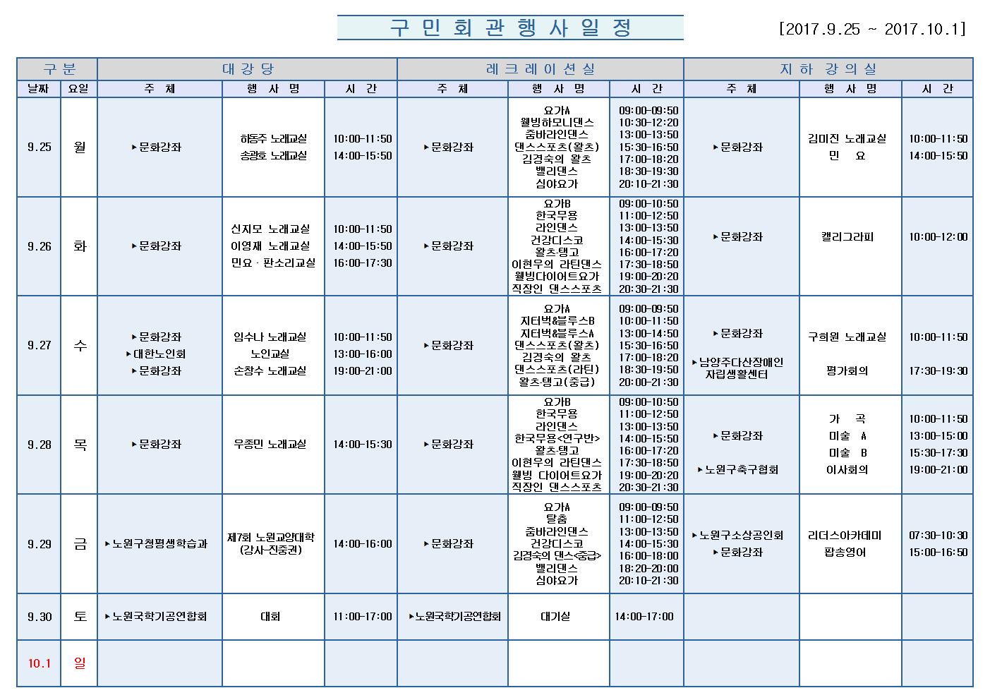 9월25일(월)부터 10월1일 (일)까지의 구민회관 행사 일정을 공지해드리오니