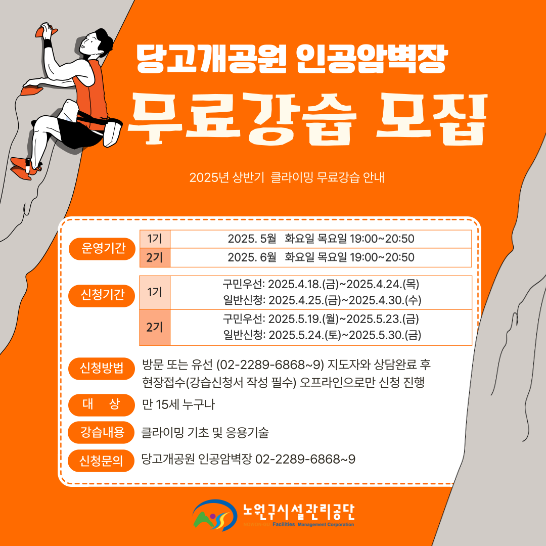 [당고개공원 인공암벽장] 2025년 상반기 클라이밍 무료 강습 안내
