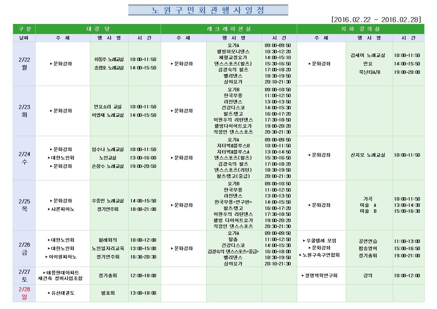 노원구민회관 행사일정표 (2016.02.22~2016.02.28) |