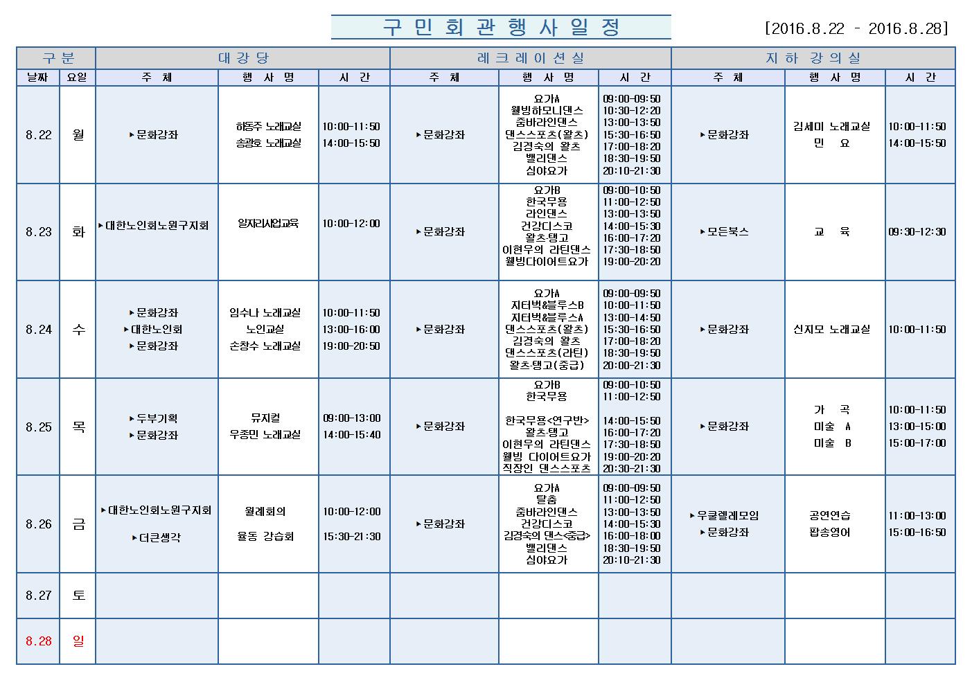 8월22일(월)부터 8월 28일 (일)까지의 구민회관 행사 일정을 공지해드리오니