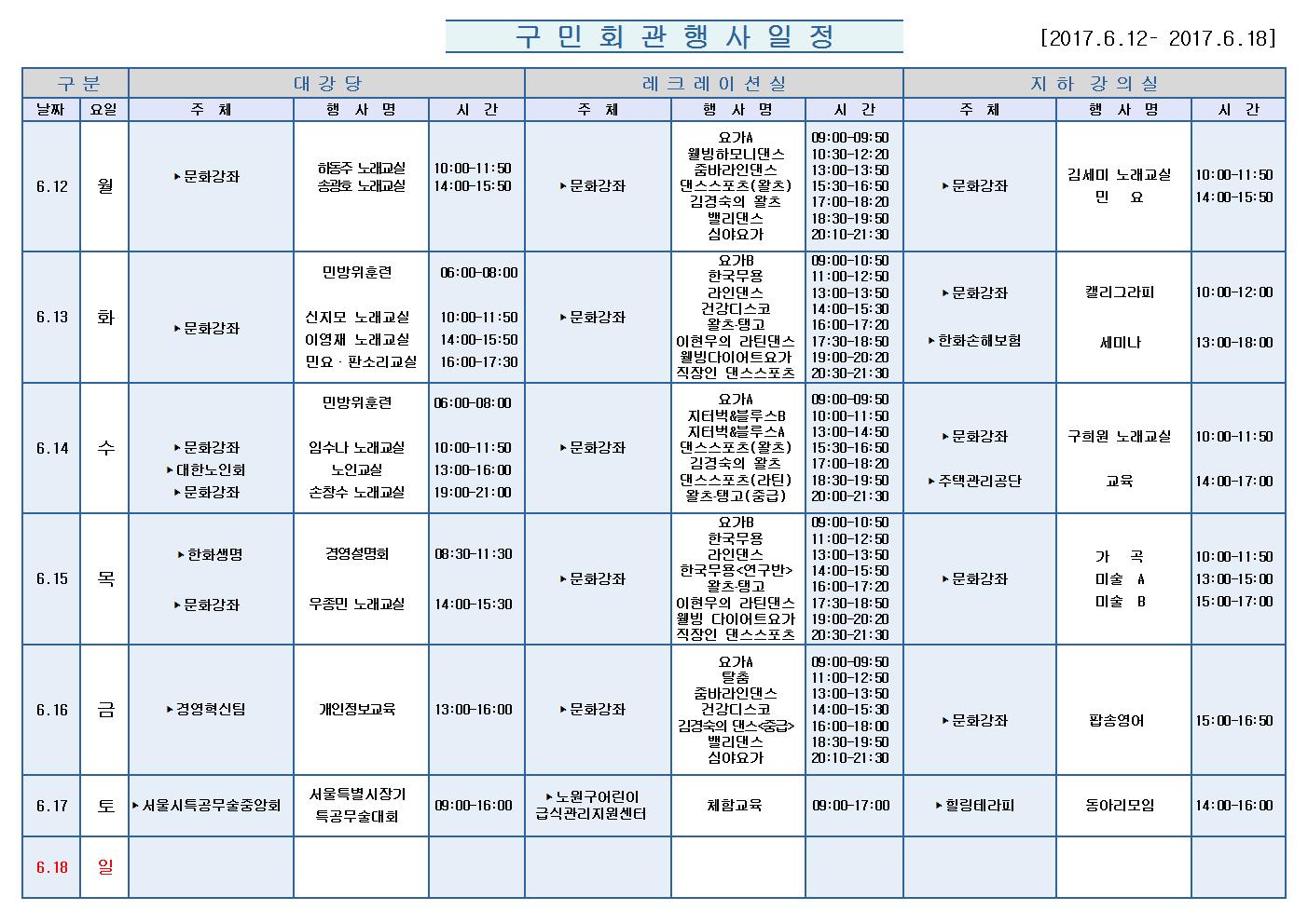6월12일(월)부터 6월18일 (일)까지의 구민회관 행사 일정을 공지해드리오니
