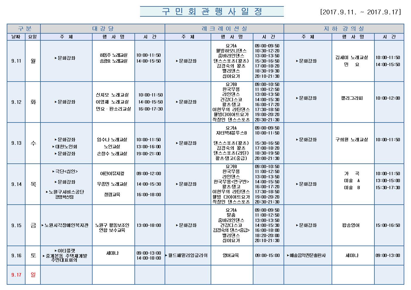 9월11일(월)부터 9월17일 (일)까지의 구민회관 행사 일정을 공지해드리오니