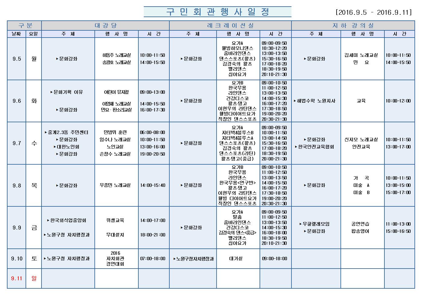 9월5일(월)부터 9월 11일 (일)까지의 구민회관 행사 일정을 공지해드리오니