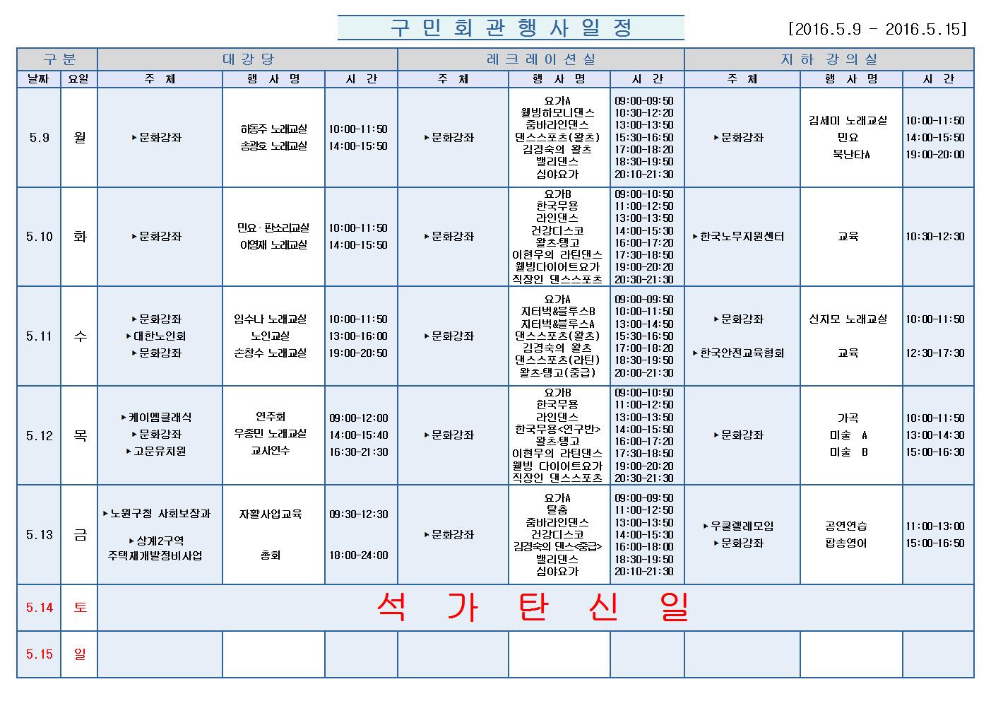 5월9일(월)부터 5월 15일 (일)까지의 구민회관 행사 일정을 공지해드리오니