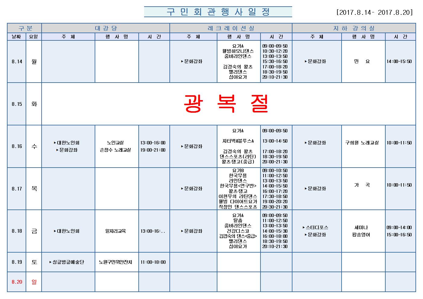 8월14일(월)부터 8월20일 (일)까지의 구민회관 행사 일정을 공지해드리오니