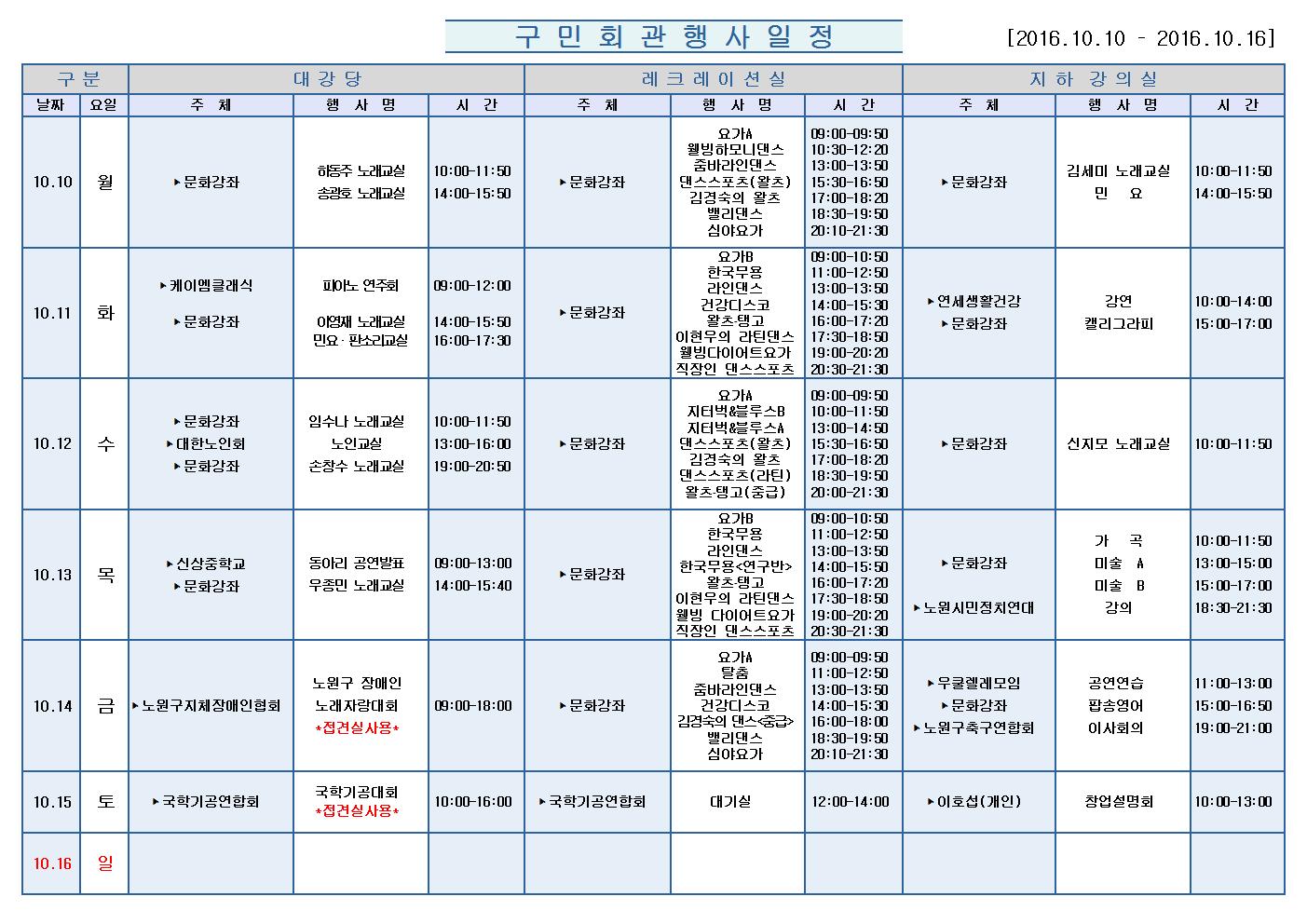 10월10일(월)부터 10월 16일 (일)까지의 구민회관 행사 일정을 공지해드리오니