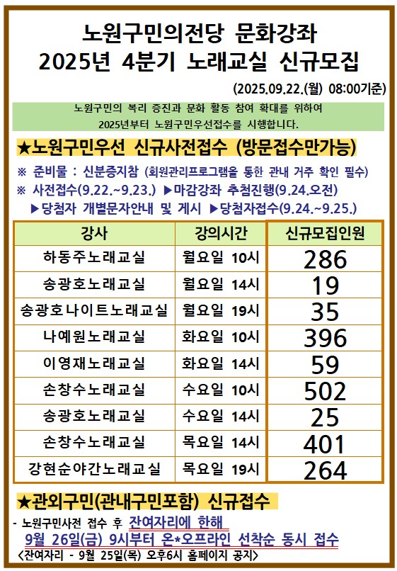 [노원구민의전당] 2025년 4분기 문화강좌 신규접수 가능인원현황