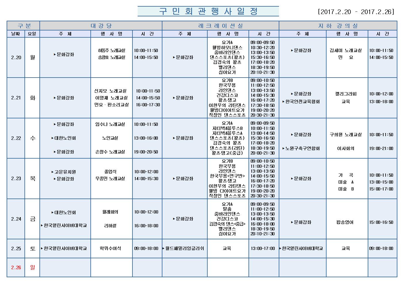 2월20일(월)부터 2월 26일 (일)까지의 구민회관 행사 일정을 공지해드리오니