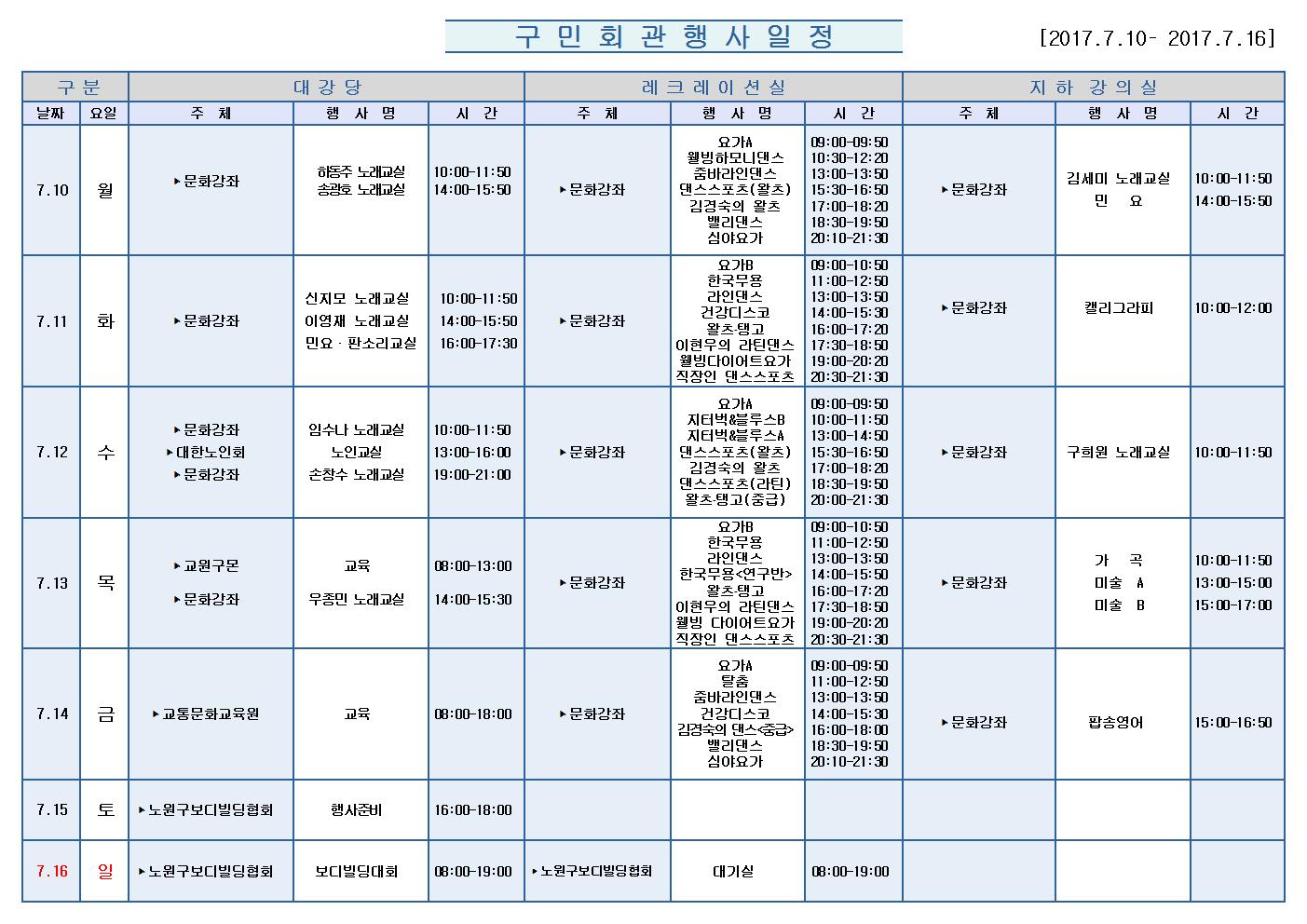 7월10일(월)부터 7월16일 (일)까지의 구민회관 행사 일정을 공지해드리오니