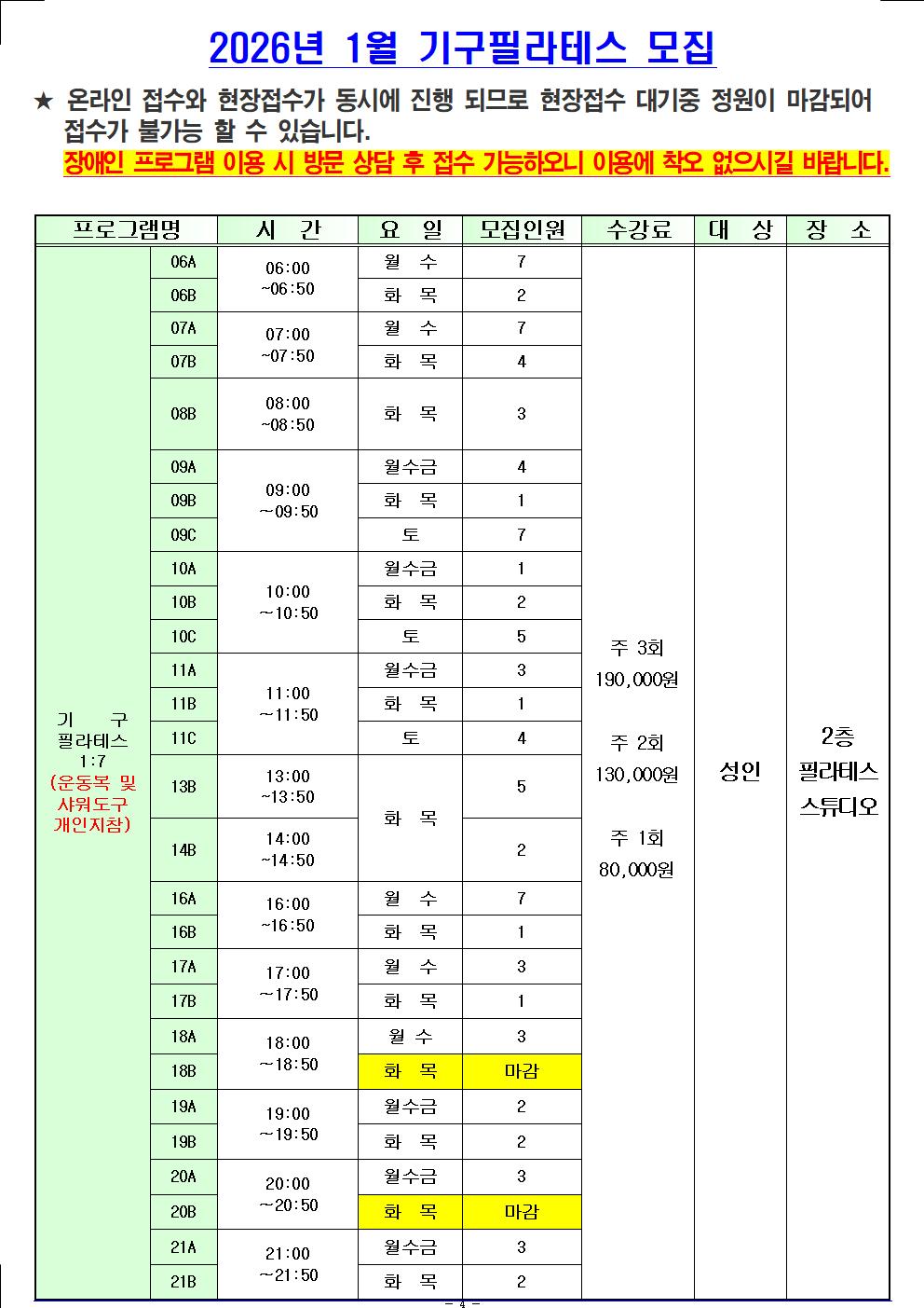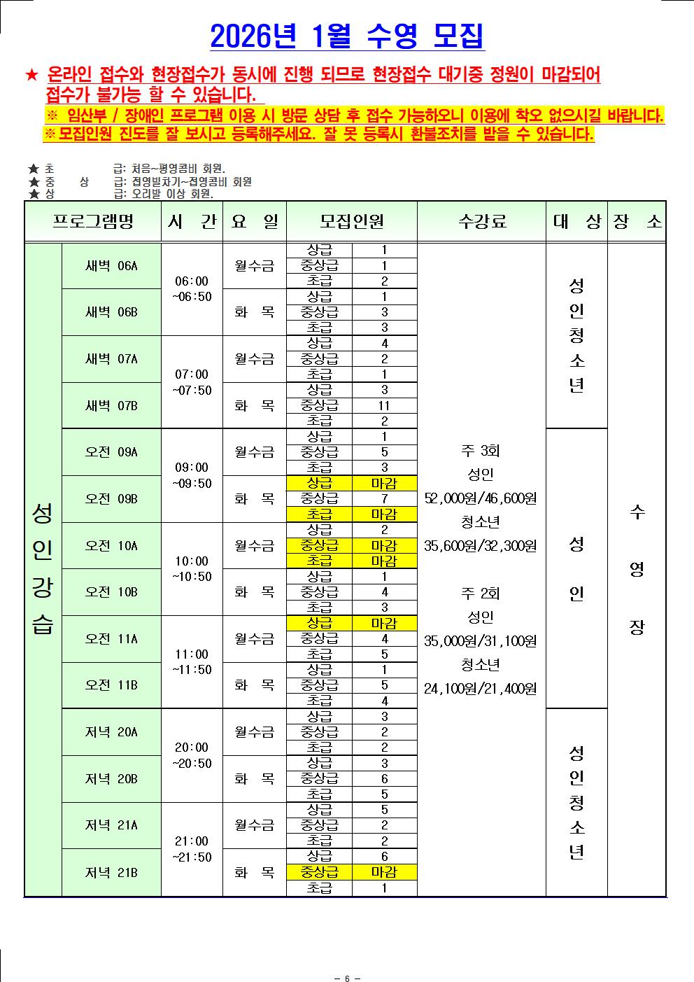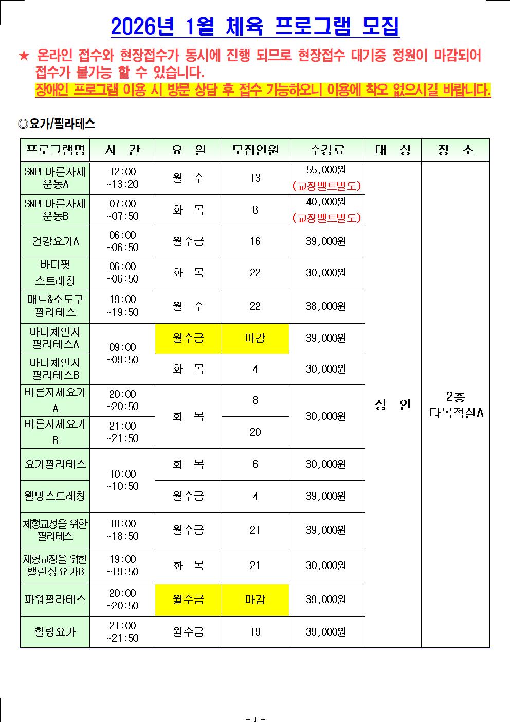 [월계구민체육센터] 2026년 1월 신규 접수 가능 인원 현황