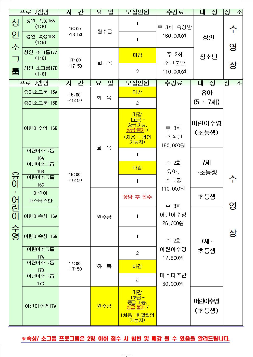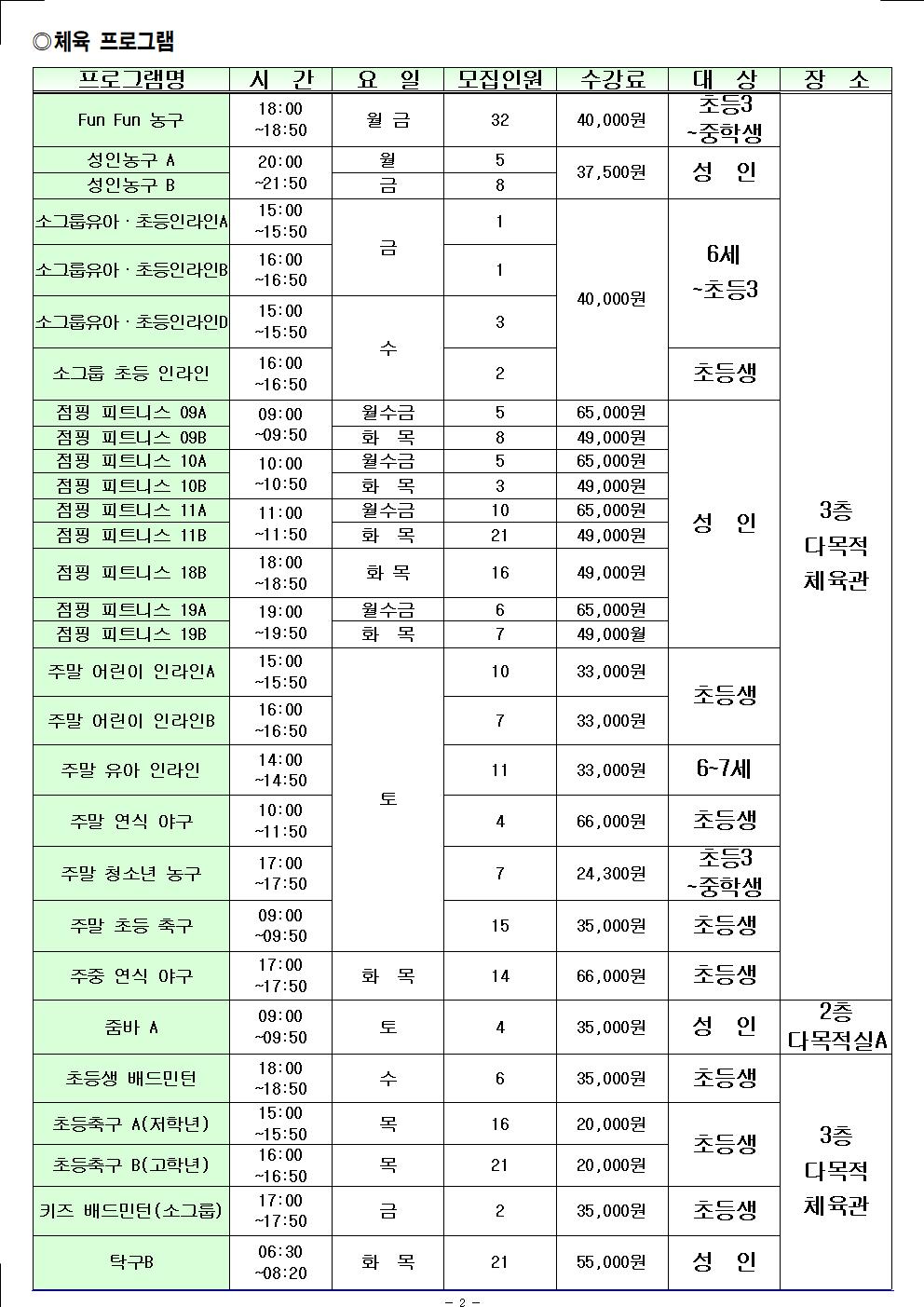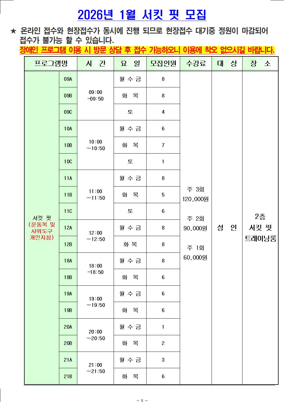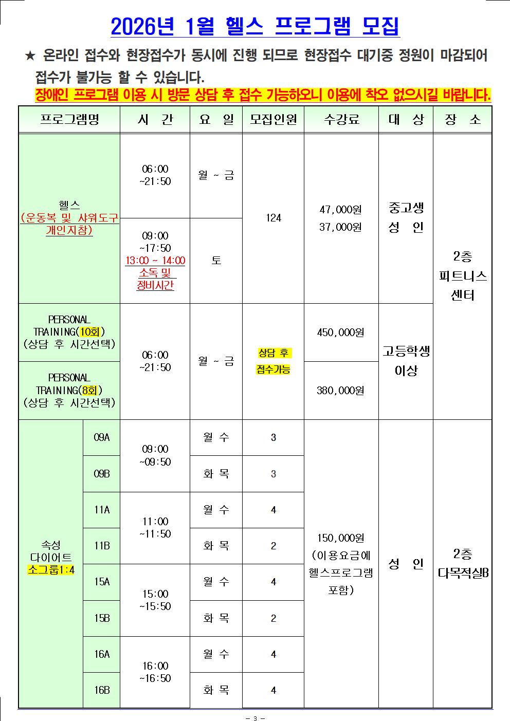 [월계구민체육센터] 2026년 1월 신규 접수 가능 인원 현황