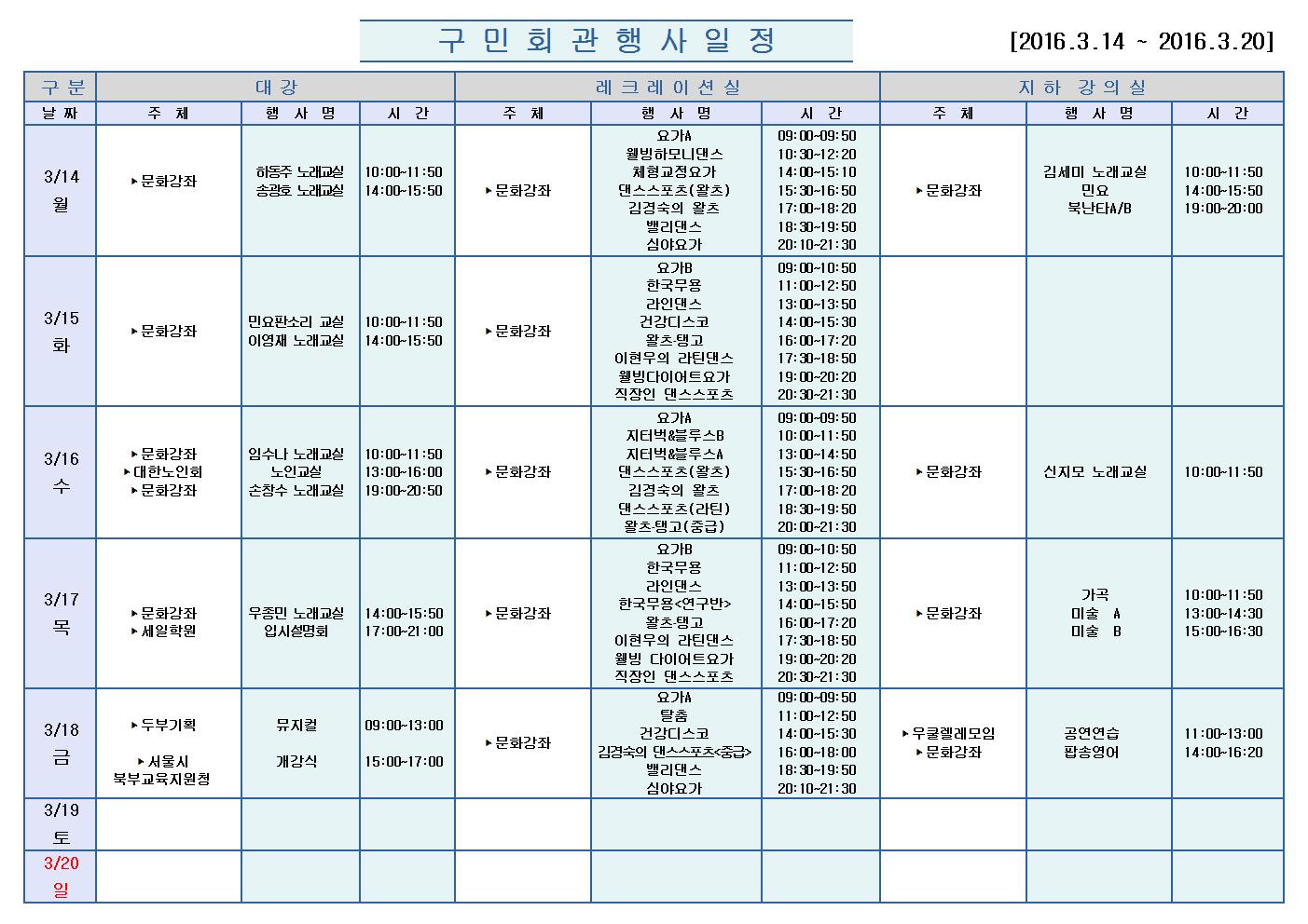 3월 14일 월요일부터 3월 20일 일요일까지의 구민회관 행사 일정을 공지해드리오니