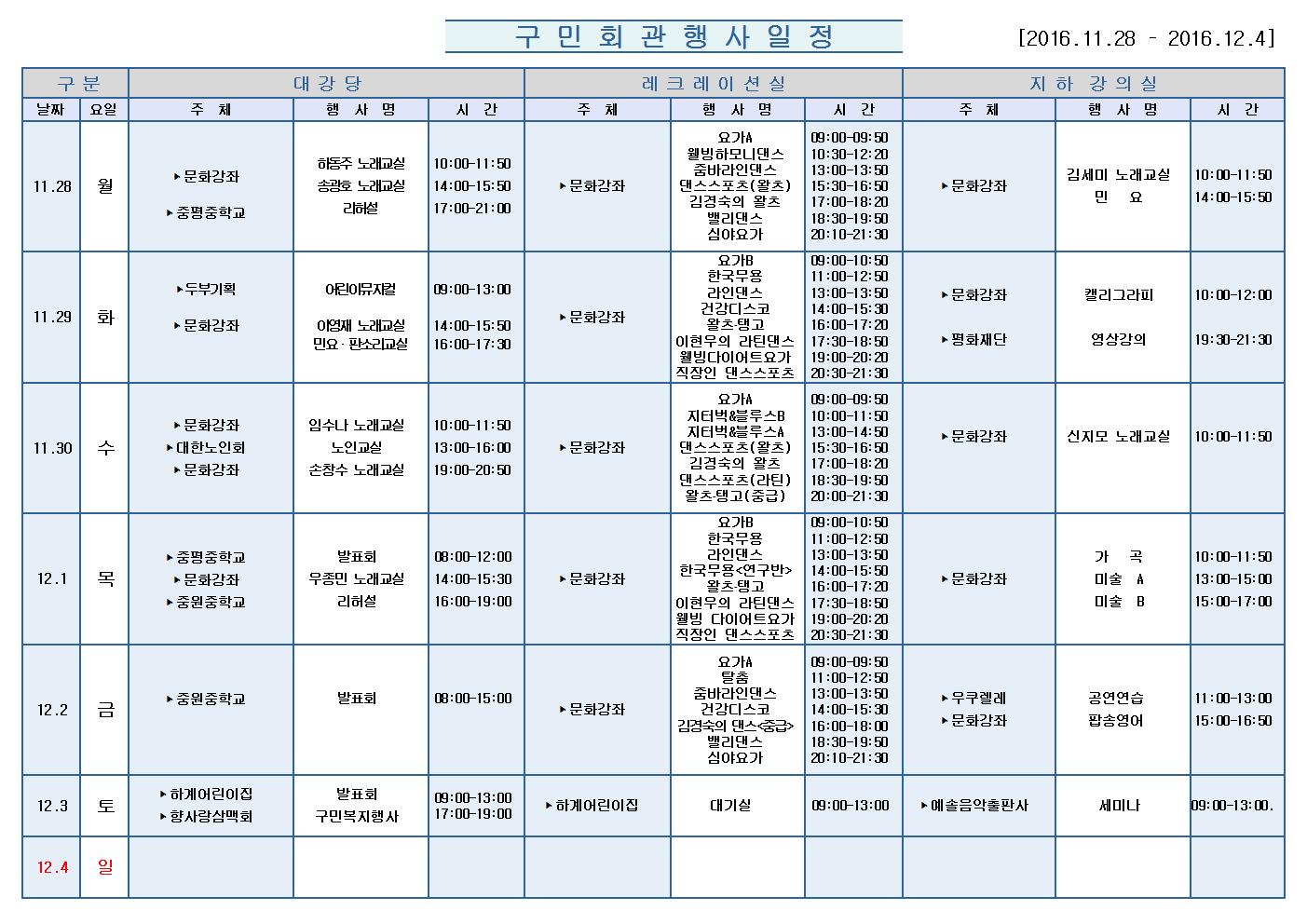 11월28일(월)부터 12월 4일 (일)까지의 구민회관 행사 일정을 공지해드리오니