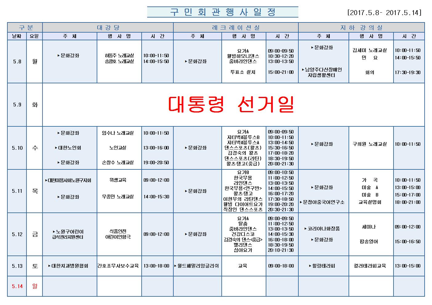 5월8일(월)부터 5월 14일 (일)까지의 구민회관 행사 일정을 공지해드리오니