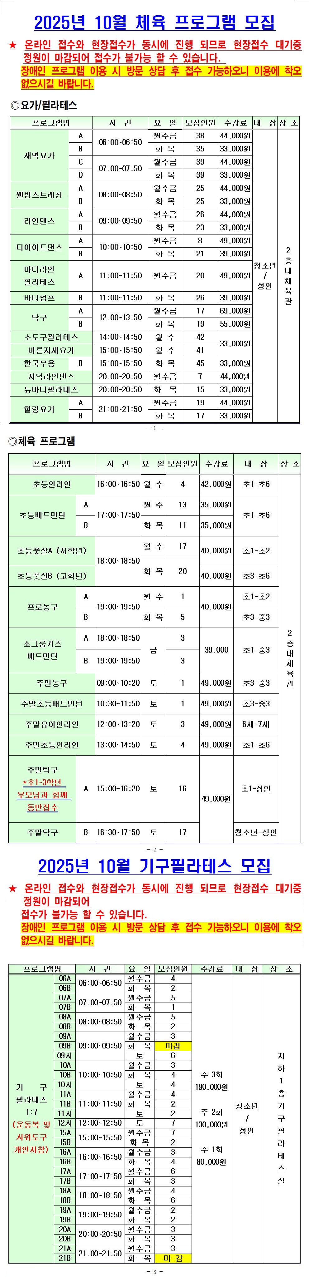 [공릉구민체육센터] 2025년 10월 신규 접수 가능 인원 현황