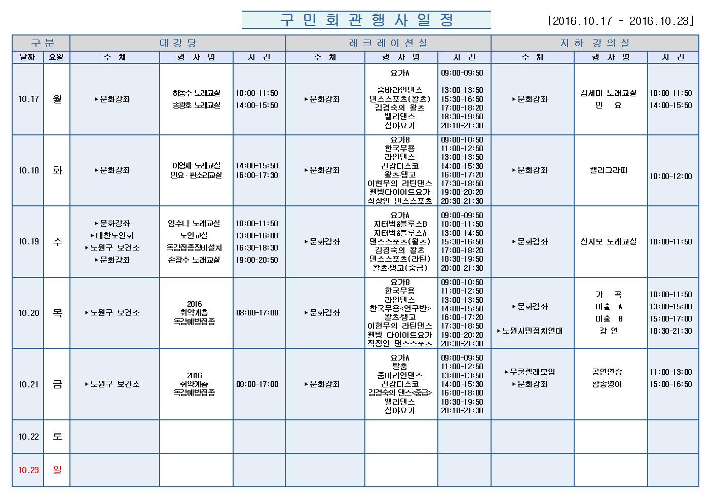 10월17일(월)부터 10월 21일 (일)까지의 구민회관 행사 일정을 공지해드리오니