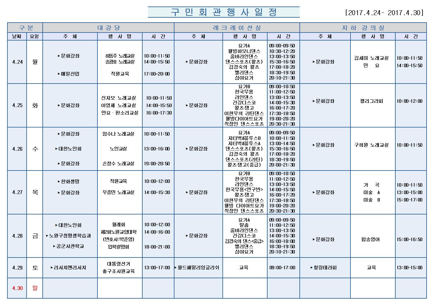 4월24일(월)부터 4월 30일 (일)까지의 구민회관 행사 일정을 공지해드리오니