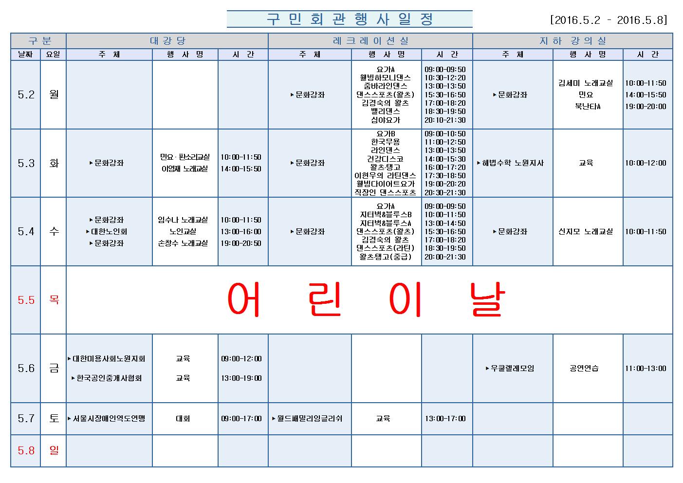 5월2일(월)부터 5월 8일 (일)까지의 구민회관 행사 일정을 공지해드리오니
