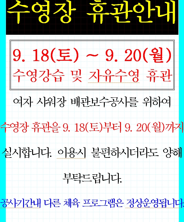 수영장 휴관을 9.18(토) 부터 9.20(월)까지 실시합니다.