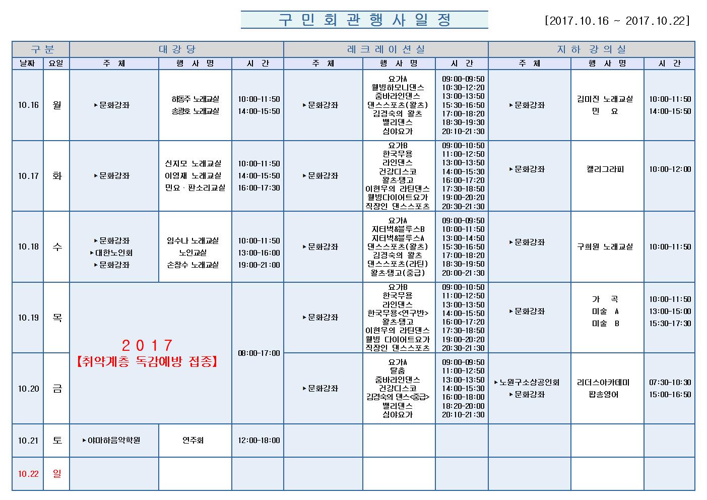 10월16일(월)부터 10월22일 (일)까지의 구민회관 행사 일정을 공지해드리오니