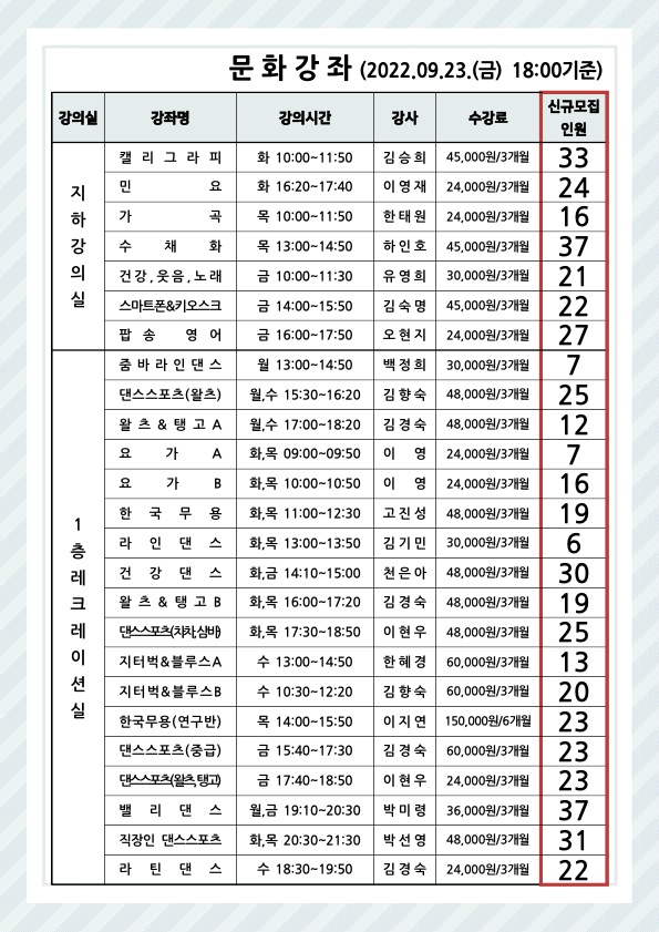 [노원구민의전당]2022년 4분기(10월 ~ 12월) 문화강좌 신규접수 가능 인원 현황