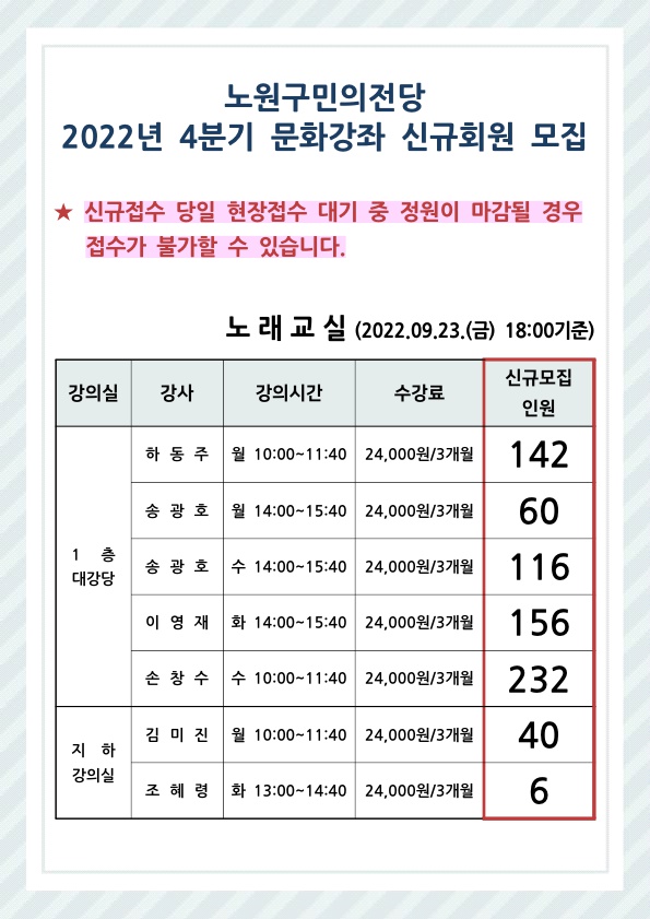 노원구민의전당 4분기(2022.10. ~ 12.) 문화강좌(노래교실, 문화강좌) 신규접수 모집인원 현황을 아래와 같이 안내드립니다.