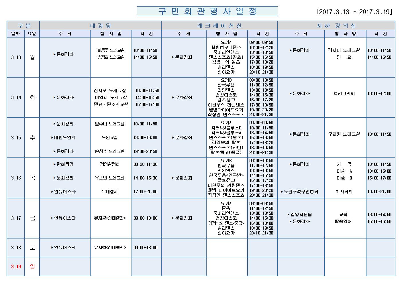 3월13일(월)부터 3월 19일 (일)까지의 구민회관 행사 일정을 공지해드리오니